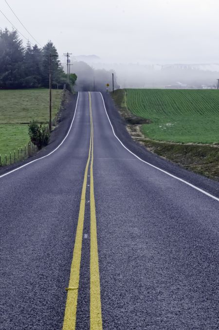 Rural road between farm fields near North Plains, Oregon, west of Portland, on a foggy morning in September