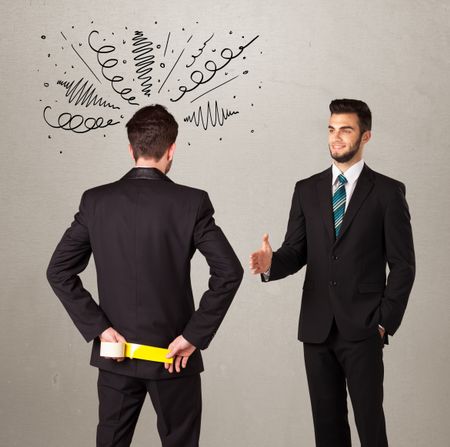 Ruthless businessman handshake with a hiding weapon and drawn curly lines around his head