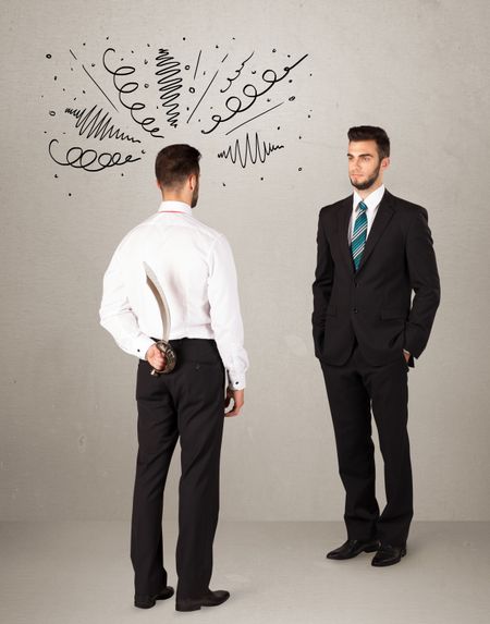 Ruthless businessman handshake with a hiding weapon and drawn curly lines around his head