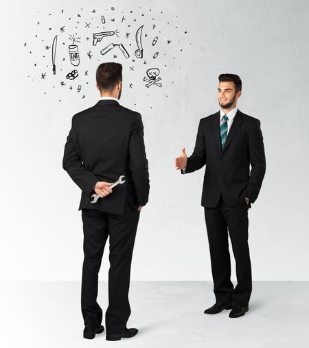 Ruthless businessman handshake with hiding a weapon and weapon symbols around his head