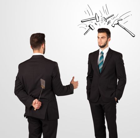 Ruthless businessman hiding a weapon white drawn beating hammer marks