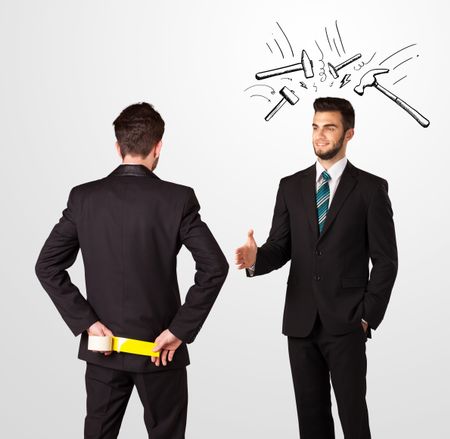Ruthless businessman hiding a weapon white drawn beating hammer marks