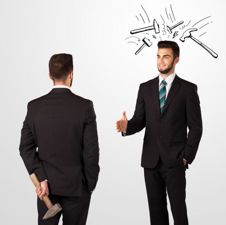 Ruthless businessman hiding a weapon white drawn beating hammer marks