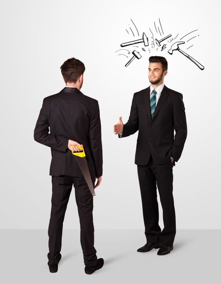 Ruthless businessman hiding a weapon white drawn beating hammer marks