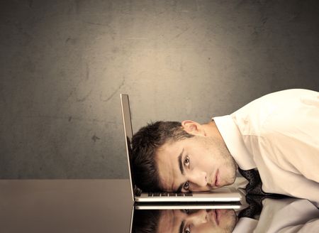 A sad and depressed office worker resting his head on a keyboard while shouting in front of a grey grungy wall background