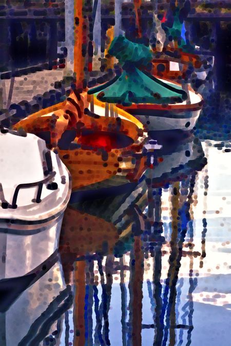 Sailboat dreams (one of a series): Varicolored abstract of sailboats tied up at marina dock, with reflections of masts and clouds on calm water