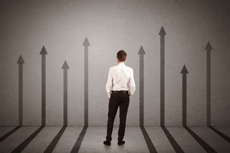 Sales person in doubt looking at arrows pointing up on the wall concept