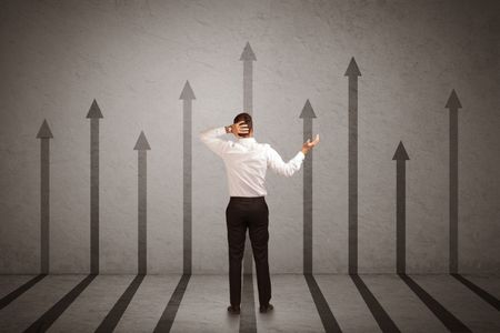 Sales person in doubt looking at arrows pointing up on the wall concept