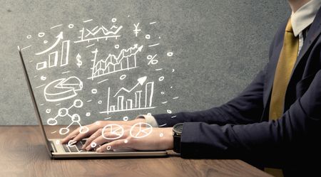 Sales person in suit using a laptop to calculate pie chart and exponential growth statistics on office desk concept