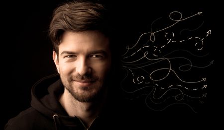A salesman in doubt can not find the solution to the problem concept with curvy lined arrows