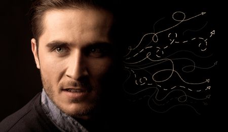 A salesman in doubt can not find the solution to the problem concept with curvy lined arrows