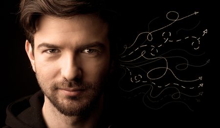 A salesman in doubt can not find the solution to the problem concept with curvy lined arrows