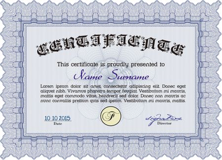 Sample certificate or diploma. With complex linear background. Vector certificate template. Elegant design. Blue color.