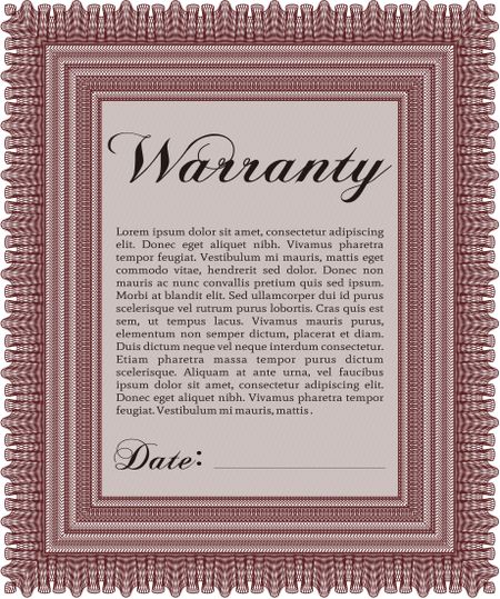 Sample Warranty certificate template. Elegant design. Vector illustration. With guilloche pattern and background.