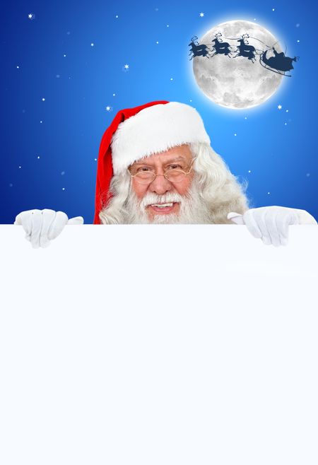 Santa Claus with a banner over a Christmas background