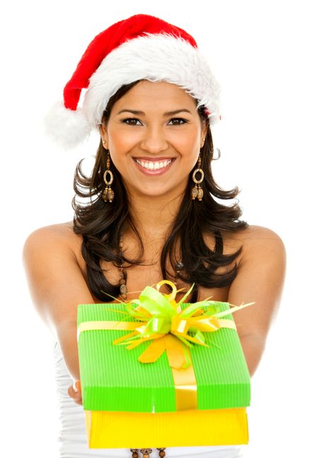 Santa woman giving a gift isolated over a white background