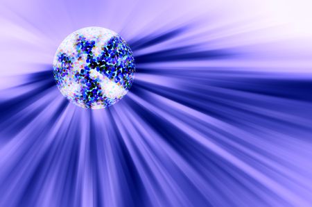 Satellite view of a pointillized planet near a starburst with radial blur, for speculative or metaphysical motifs of massive phenomena in outer space, or climate change during a huge solar event
