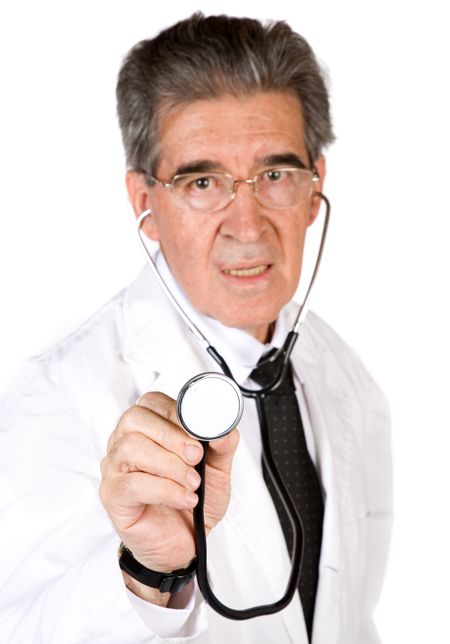 senior male doctor over a white background with a stethoscope (focus on stethoscope )
