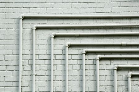 Series of parallel pipes, each with 90-degree turn, along whitewashed brick wall