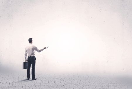 Serious business man standing on grey brick floor and thinging about decisions concept