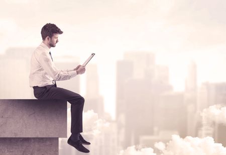 A serious business person sitting with laptop and tablet at the edge of a tall building, looking over cloudy city scape concept