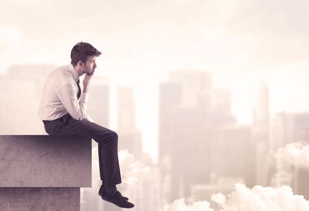 A serious business person sitting with laptop and tablet at the edge of a tall building, looking over cloudy city scape concept