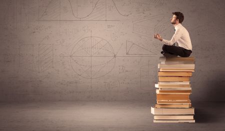 A serious businessman in suit sitting on a pile of giant books in front of a greyish brown wall with drawn lines, angles, numbers, circles and curves.