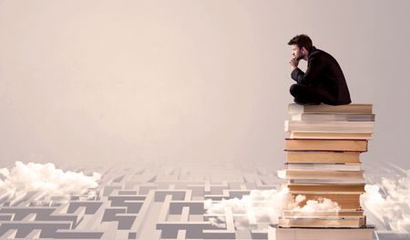 A serious businessman in suit sitting on a pile of giant books in front of a grey wall with clouds, labirynth