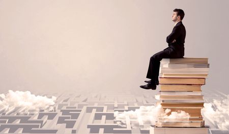 A serious businessman in suit sitting on a pile of giant books in front of a grey wall with clouds, labirynth