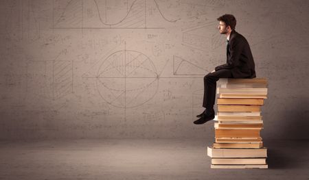 A serious businessman in suit sitting on a pile of giant books in front of a greyish brown wall with drawn lines, angles, numbers, circles and curves.