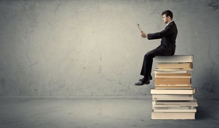 A serious businessman with tablet in hand in suit sitting on a pile of giant books in front of a textured grey wall.