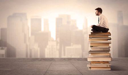 A serious student in elegant suit sitting on a pile of books looking over a brown sepia city landscape