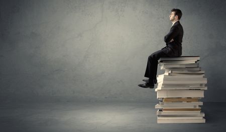 A serious student in elegant suit sitting on a stack of books in front of dark grey background