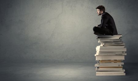A serious student in elegant suit sitting on a stack of books in front of dark grey background