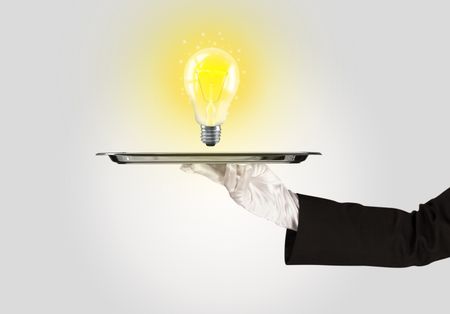 Serving a bright business idea concept using a bulb with bright sparkling warm yellow light presented on a silver plate