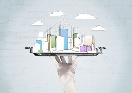 Serving a city concept with close up of waiter hand in gloves holding silver plate in front of grey brick wall