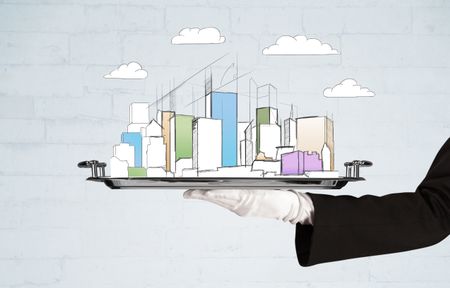 Serving a city concept with close up of waiter hand in gloves holding silver plate in front of grey brick wall
