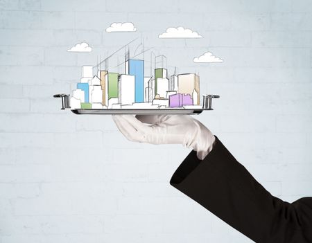 Serving a city concept with close up of waiter hand in gloves holding silver plate in front of grey brick wall