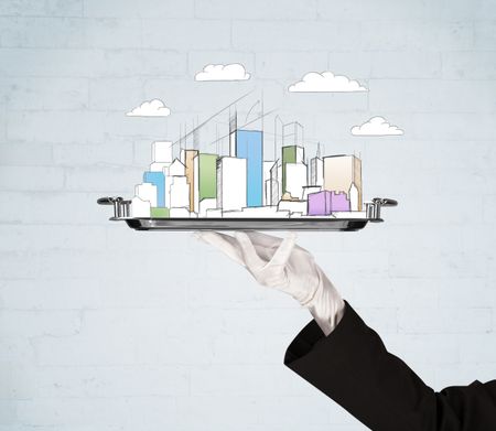 Serving a city concept with close up of waiter hand in gloves holding silver plate in front of grey brick wall