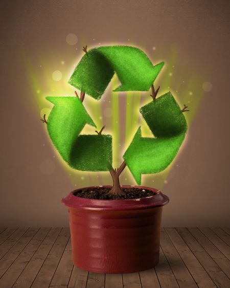 Shining recycle sign growing out of flowerpot concept