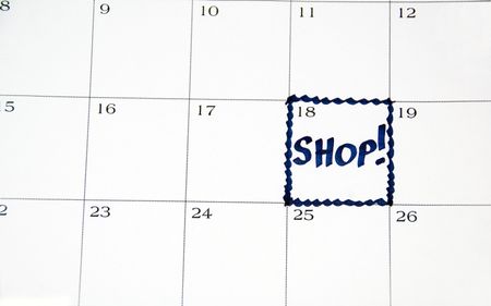 SHOP! written in blue on one day of white monthly calendar (close-up)