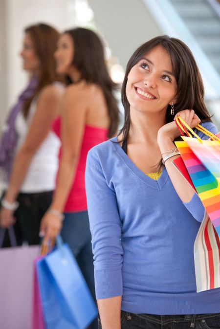 Shopping woman with bags in a mall and some friends behind her