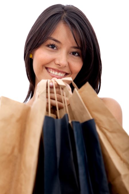 Shopping woman with bags smiling - isolated over a white background