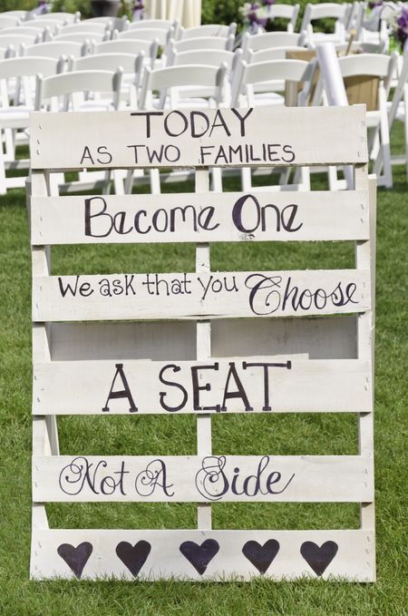 Sign at outdoor wedding: "Today as two families become one we ask that you choose a seat not a side"