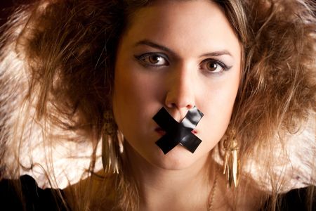Silenced eccentric woman with tape over her mouth