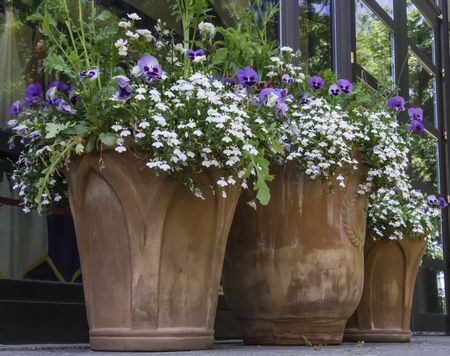 Similar floral arrangements in three flower pots in front of museum, spring in northern Illinois, USA