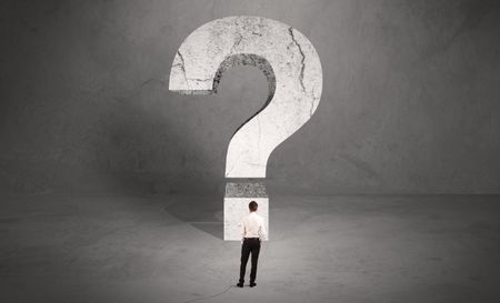 A small elegant business person in suit standing with his back in front of a huge question mark in open space concept