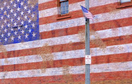 Small-town street scene in Illinois: American flag flapping in breeze by huge painted American flag fading from brick wall