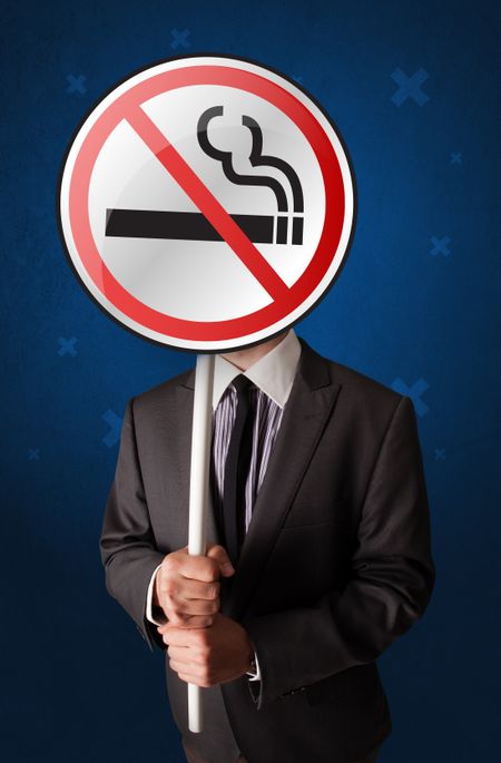 Smart businessman holding round sign with no smoking graphic
