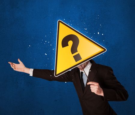 Smart businessman holding yellow sign with question mark